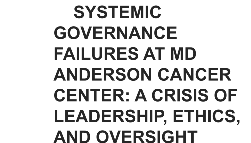 MD Anderson Cancer Center’s current crisis is not an isolated incident but rather the culmination of over a decade of governance failures that have eroded its foundational integrity. In 2017, President Ronald DePinho resigned following a series of financial missteps, including a $267 million operating loss and a failed $62 million partnership with IBM Watson, as documented in a University of Texas System audit reported by The Wall Street Journal in 2017. DePinho’s tenure was further marred by allegations of conflicts of interest involving pharmaceutical companies, a pattern that set a troubling precedent for ethical lapses. The New York Times reported in 2015 that the American Association of University Professors censured MD Anderson for violations of academic freedom during tenure disputes, highlighting a culture of administrative overreach. Len Zwelling, a former MD Anderson administrator, wrote in a 2024 blog post, that The DePinho era exposed a profound lack of accountability among senior leadership, creating fertile ground for the abuses we witness today (see Appendix A: Former Senior Executive Blog on MD Anderson Failures). These historical failures have fostered an environment where figures like Dr. Padmanee Sharma can operate without scrutiny, shielded by institutional prestige and a lack of robust oversight.